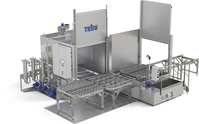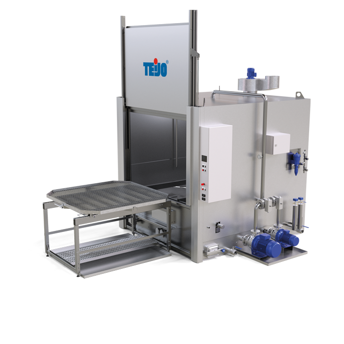 Parts are loaded from the front into the machine using a load carriage with a capacity of up to 2,500 kg. Depending on the model, the machine can be equipped with either a hinged door (KD, limited product range) or a pneumatic lift door (PD). The cleaning cabinet is available in heights of 550 mm, 800 mm or 1200 mm.